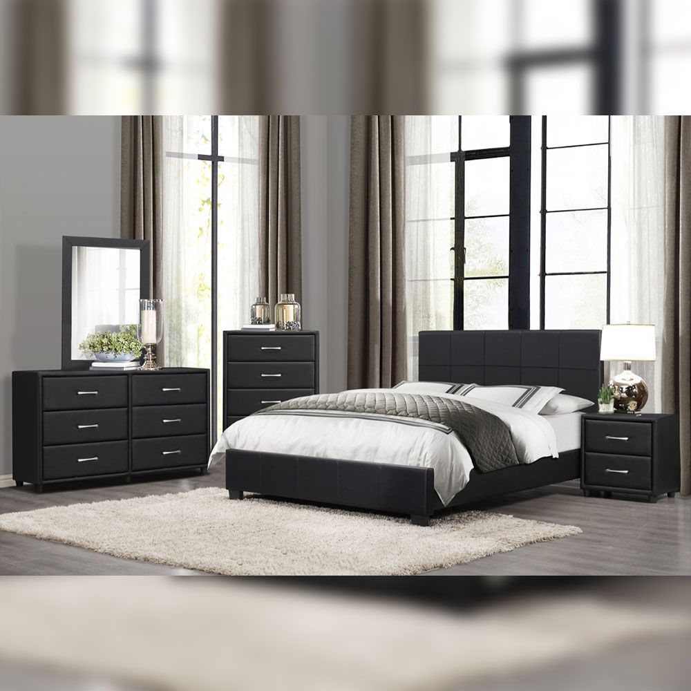 The contemporary design of the Lorenzi Bedroom Set Collection is enhanced by the addition of the durable black or brown faux leather covering that encases each piece in the collection. Silver tone hardware provides a distinct contrast to the fabric’s finish. Scaled for urban living, this collection will prove to be a unique and stylish addition to your master, youth, and guest bedrooms.